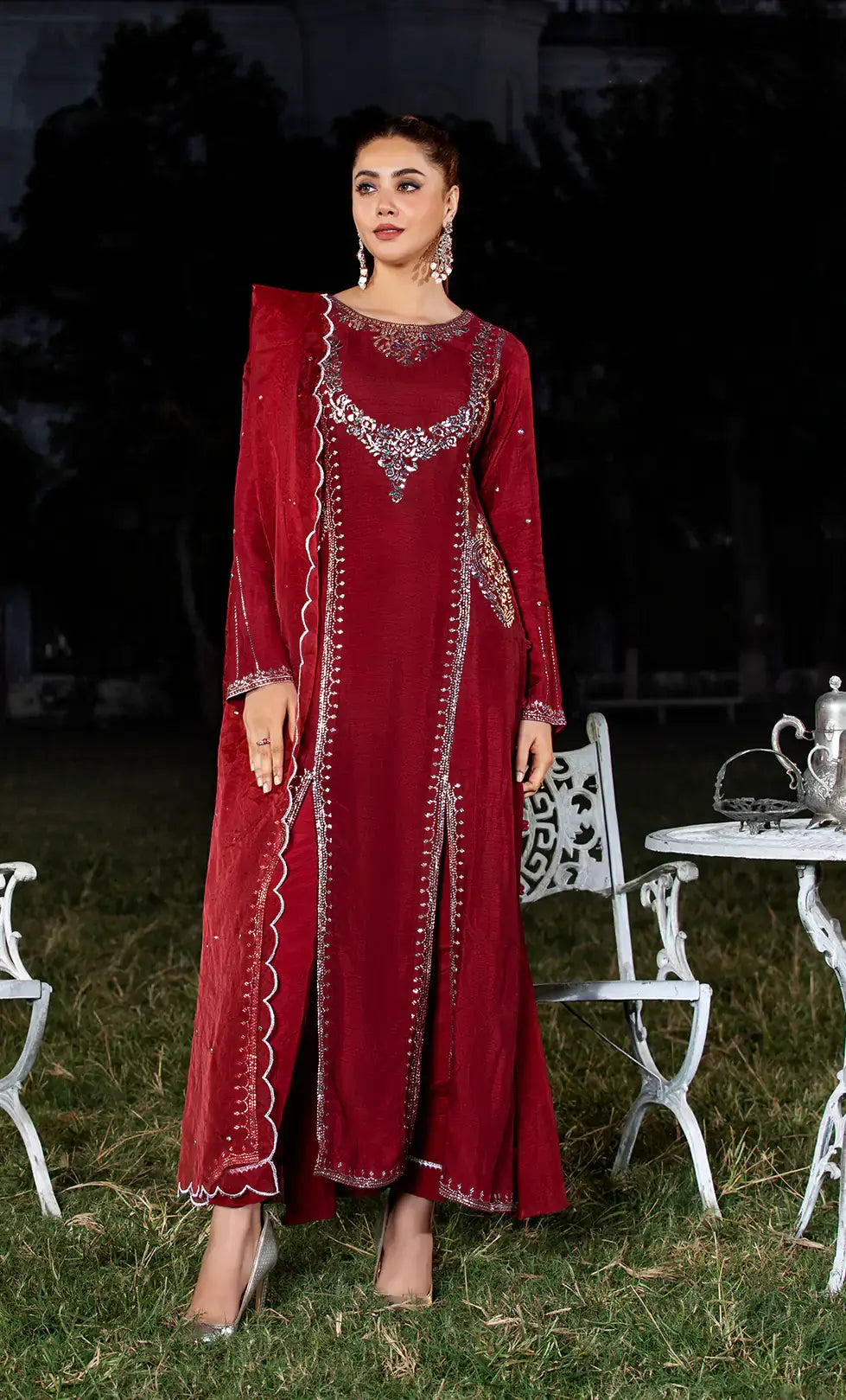 Crafted with precision and care, this dress features a shirt and trouser ensemble meticulously fashioned from the finest raw silk, complemented by a graceful organza dupatta—all adorned in a regal shade of maroon.