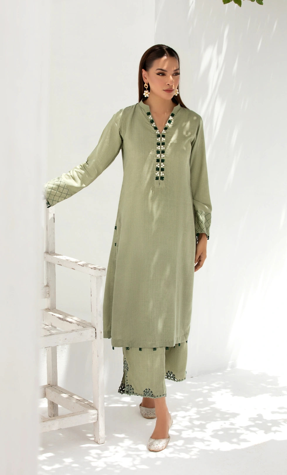 The Olive Green Viscose Dress is simply beautiful. The pearls and loops on the neckline and side slit are lovely, and the cutwork embroidery on the trousers is exquisite.