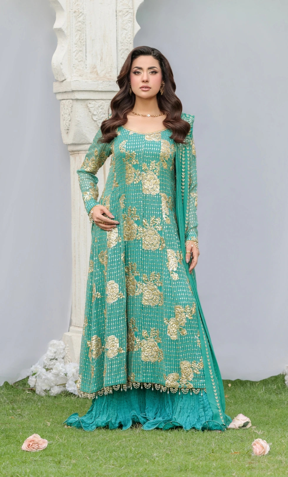 Tilla and sitara work on shirt. Crushed sharara. Beads and tilla work on dupatta.