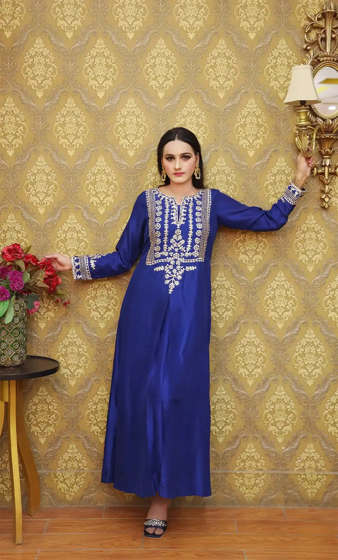 Indulge in the allure of our navy blue raw silk long shirt, gracefully enhanced by a box pleat and adorned with silver Gotta trim around the keyhole neckline. This aesthetically pleasing design exudes elegance and sophistication, making it a captivating addition to your wardrobe. Embrace timeless beauty and elevate your style with this stunning piece.