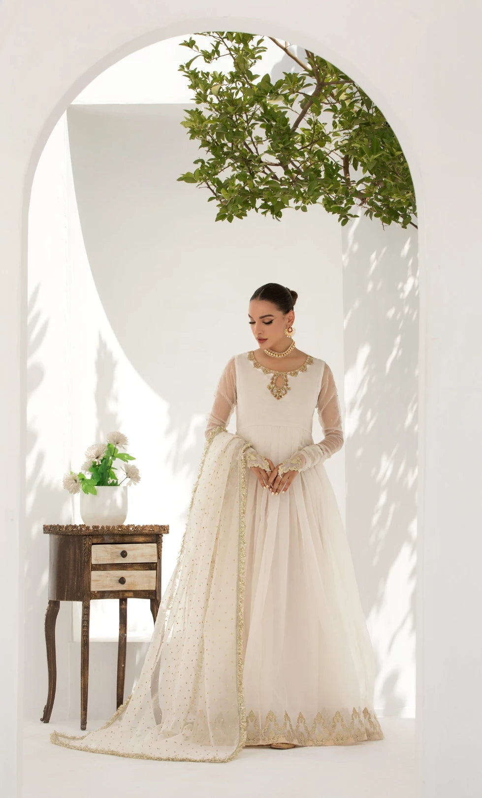 The Ivory Organza Pishwas is simply stunning! The gold work on the neckline and border is so intricate, and the kiran-edged dupatta adds a classic touch. I felt truly elegant wearing it to a family wedding.