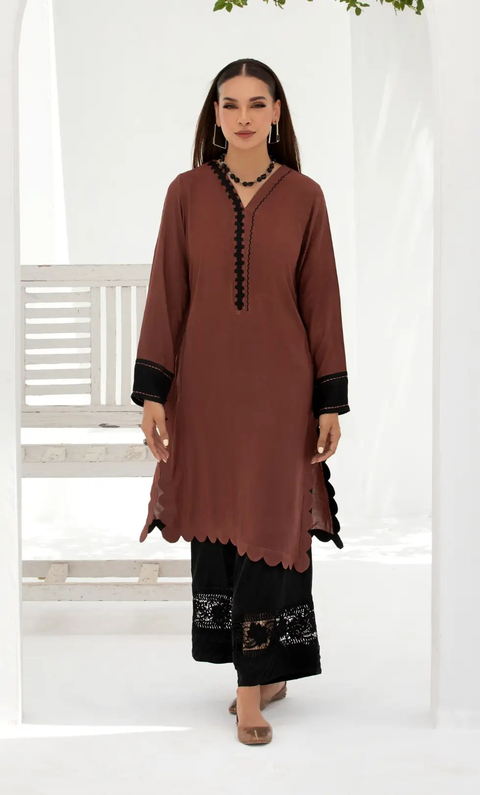 Enhance your summer wardrobe with our chic Brown Urban Fabric Dress. This stylish dress features intricate embroidery on the neckline, complemented by elegant scallops on the side slit and border, adding a modern twist to traditional elements. The urban fabric ensures both comfort and a refined look, perfect for any occasion.