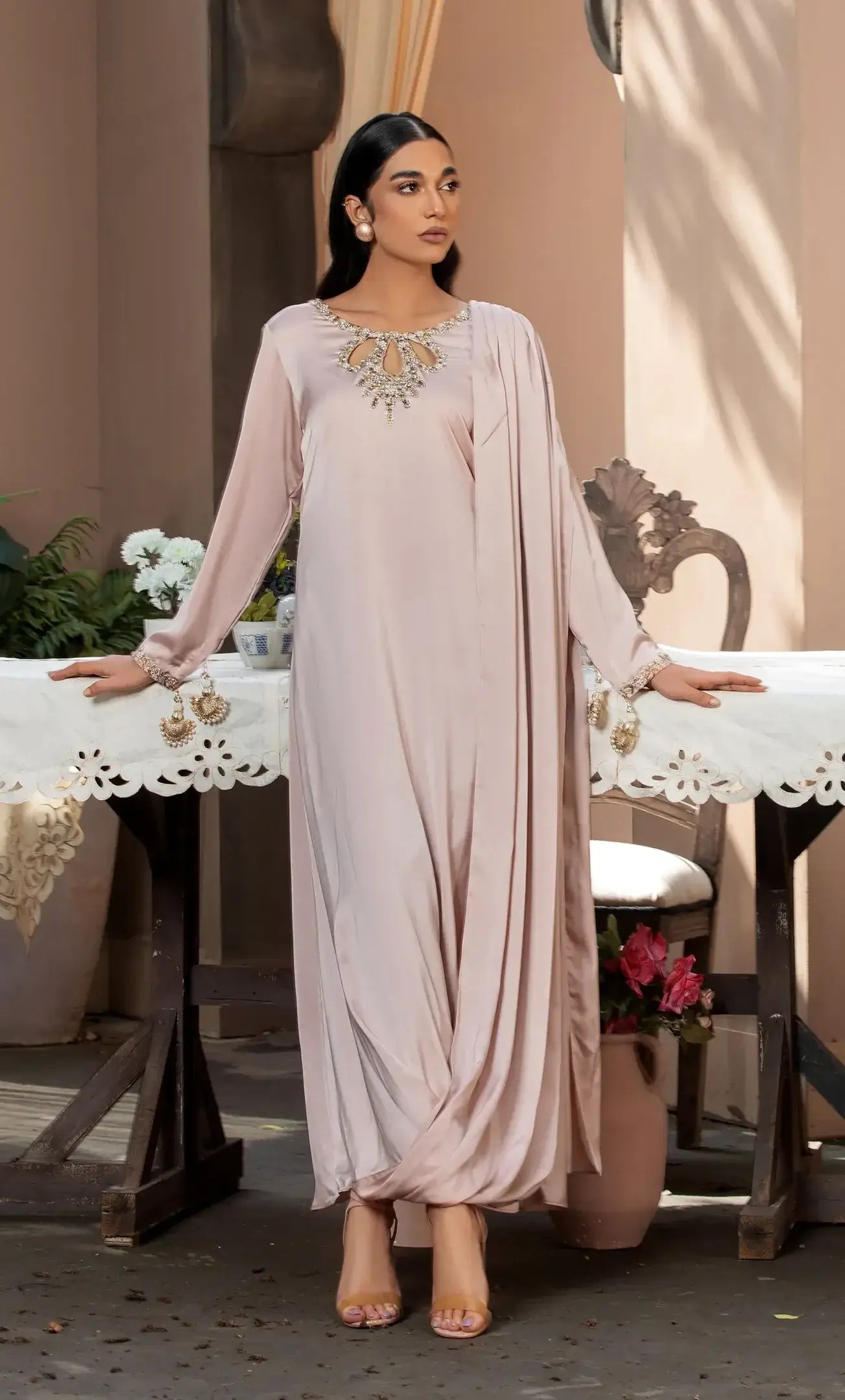 Powder pink drape shirt with intricate hand embellishment on the neckline and sleeves.