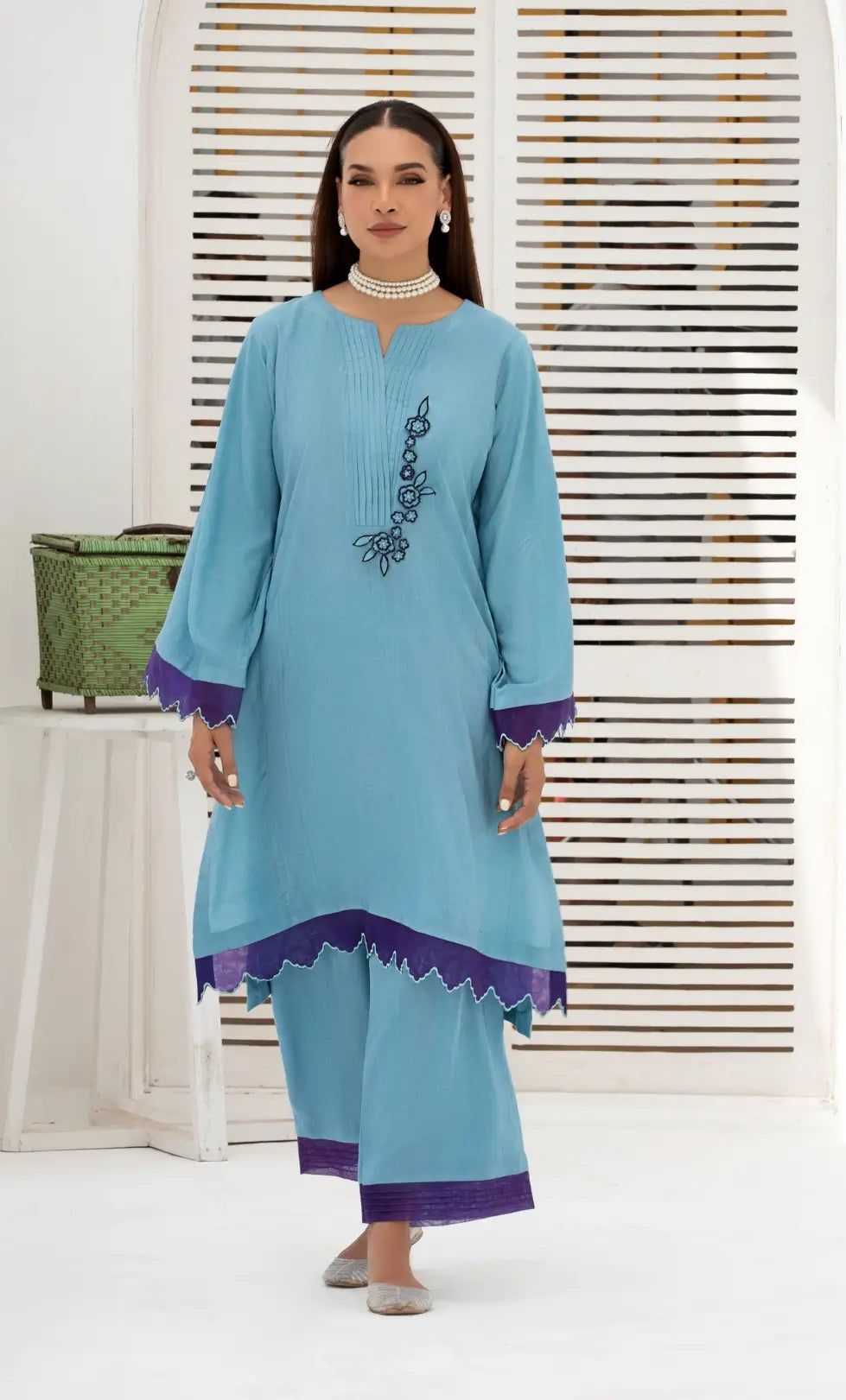 Refresh your summer wardrobe with our enchanting Sky Blue Viscose Dress. The luxurious viscose fabric for both the shirt and trousers offers a light and airy feel, ideal for warm weather. The shirt is beautifully embellished with 3D flowers on the neckline and detailed with organza cutwork on the sleeves and border, adding a unique and stylish touch. The trousers feature elegant pleated organza, completing the sophisticated ensemble.