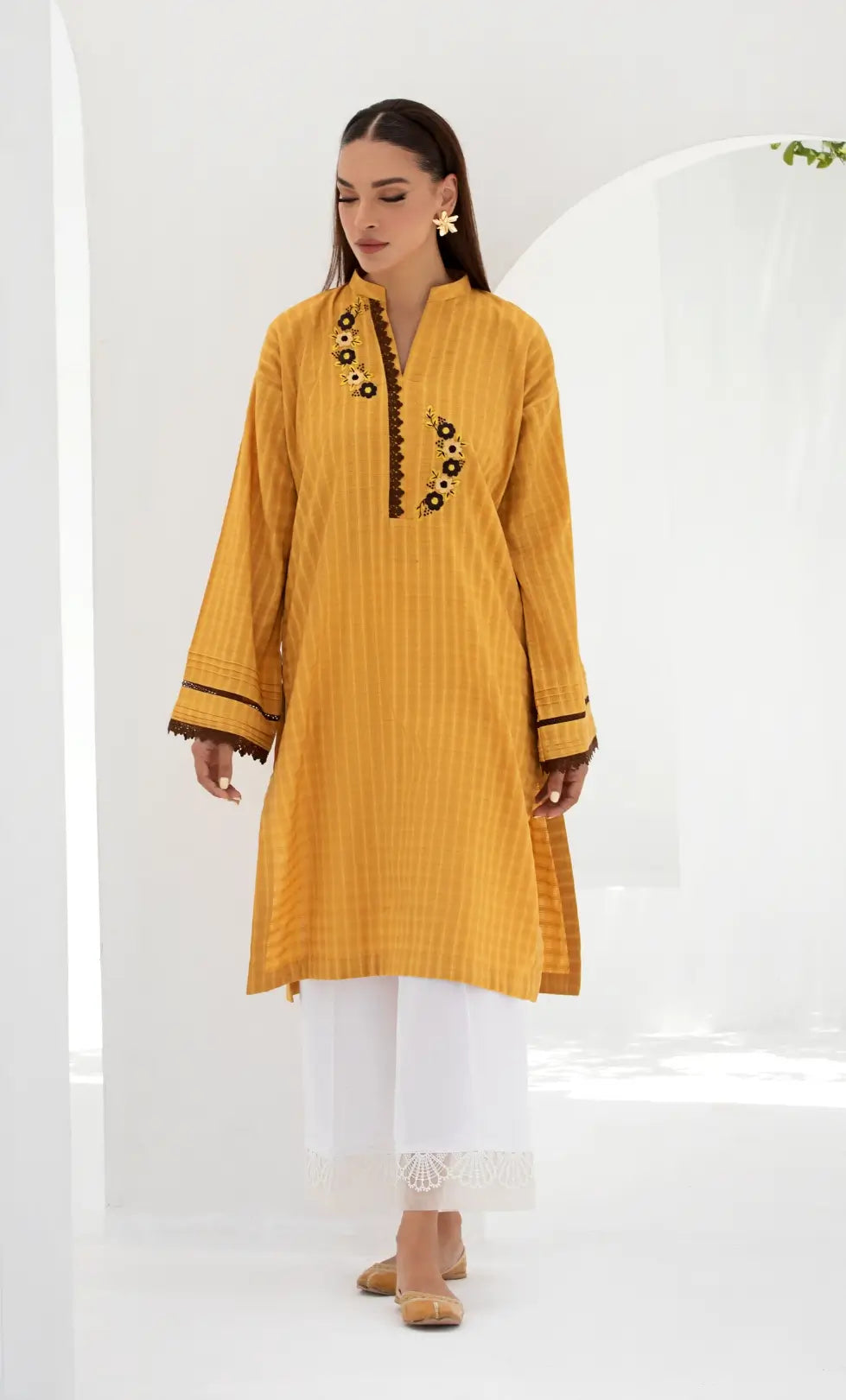 I absolutely love the Mustard Summer Basics Dress! The self-jacquard cotton is so comfortable, and the thread embroidery on the neckline and sleeves is simply beautiful. Perfect for summer!