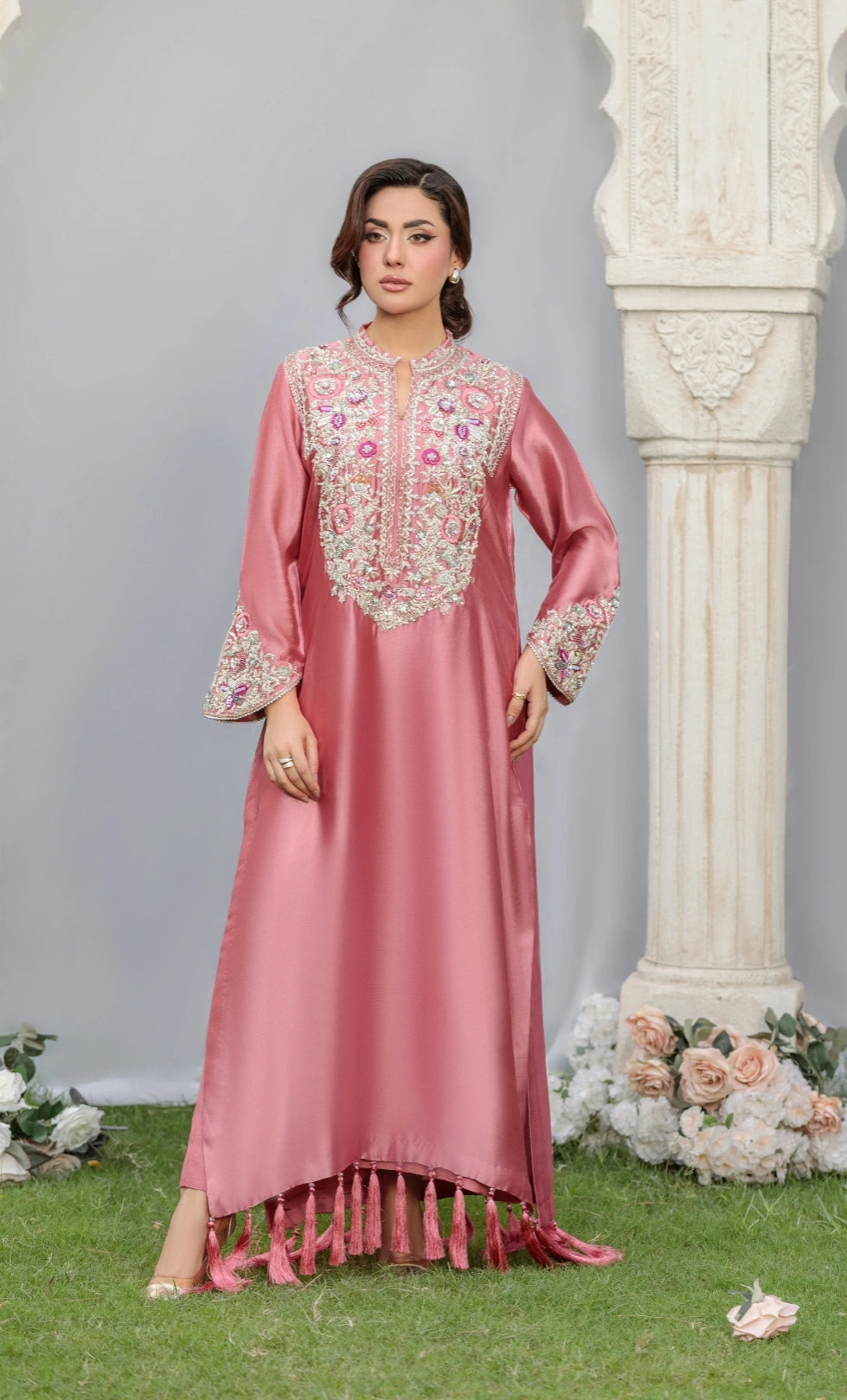 Cut danna, crystal and naqshi work on neckline and sleeves. Tassels on the border of shirt.