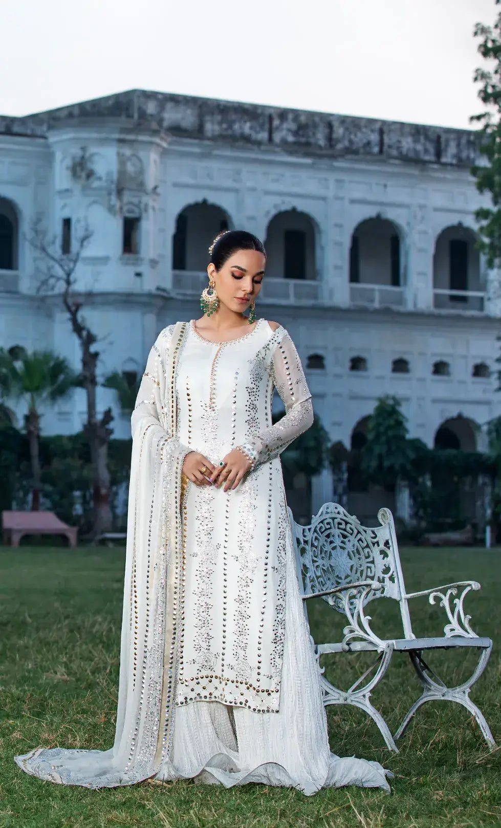 Elevate your style with our exquisite hand-embellished Mukesh shirt paired with a luxurious crushed silk palazzo. Immerse yourself in the artistry of South Punjab, where every detail is a testament to sophistication. Embrace the beauty of Ivory in this stunning ensemble, crafted with precision and passion. Indulge in the allure of chiffon and silk, and make a statement that resonates with the essence of luxury.