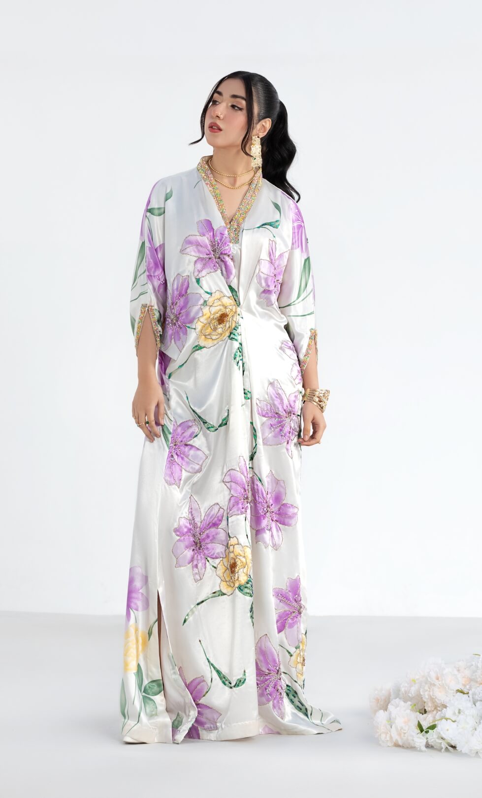 Silk kaftan with crystals, gotta and sequence embellishment on front and buggle beads work on neckline and sleeves.