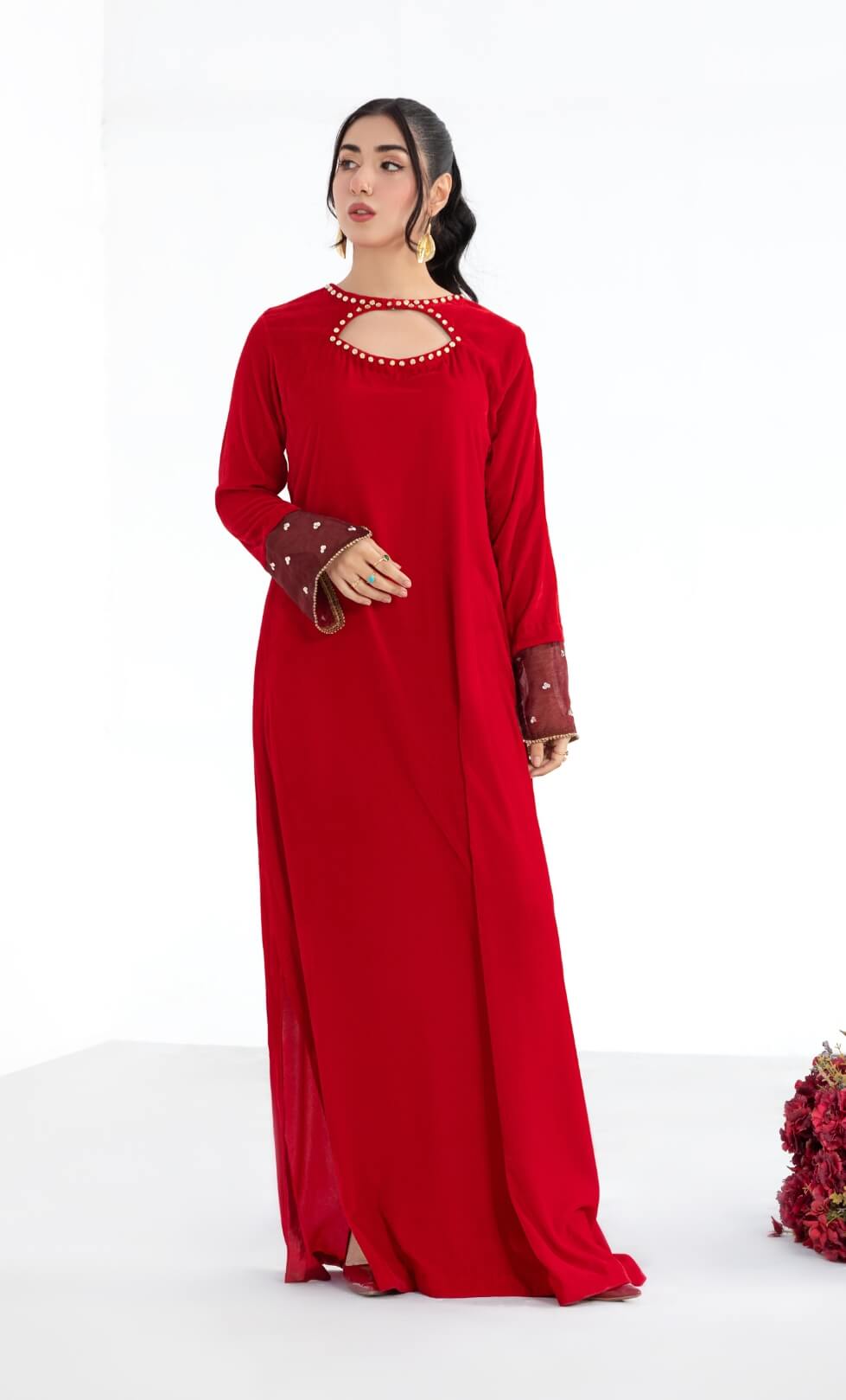 velvet kaftan with stones and organza detail on front. Heavily embellished organza dupatta with block print, dabqa, naqshi, buggle beads and cut dana work.