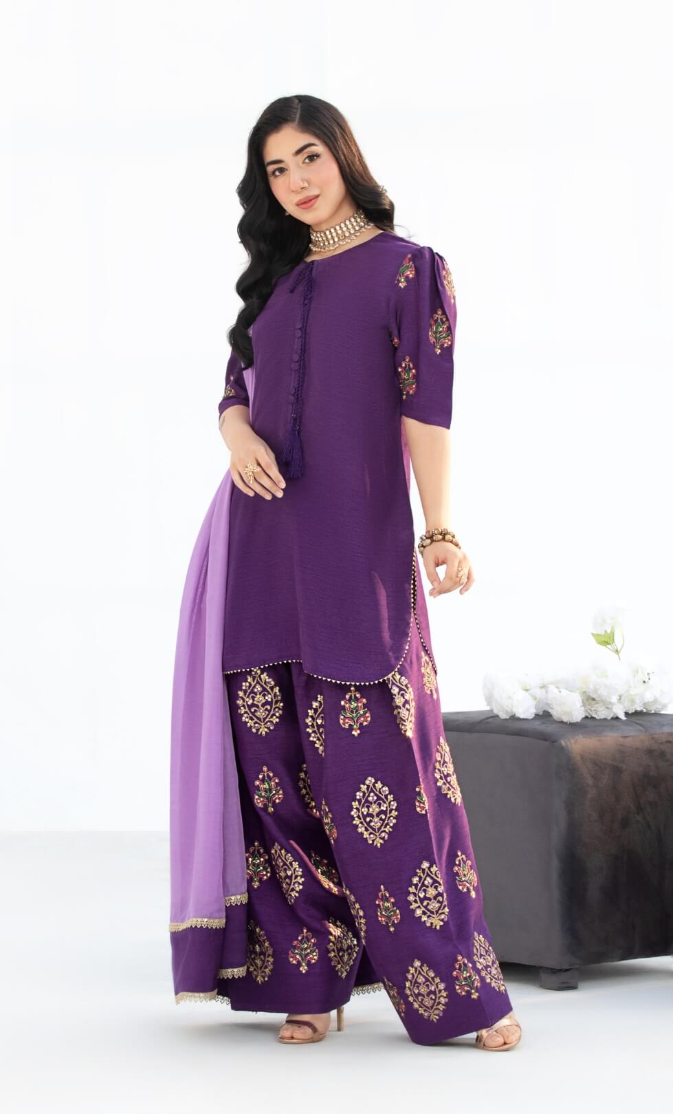 Raw silk shirt with block prink, sequence, buggle beads and cut dana work on sleeves with tassel detail on front. Heavily embellished shalwar with block print, sequence, buggle beads, naqshi and cut dana work. Silk dupatta with sequence lace.